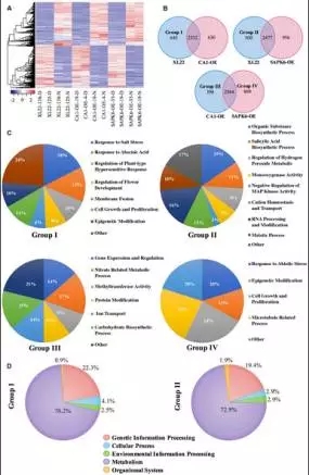 c)由于轉(zhuǎn)基因材料中過表達(dá)基因?yàn)閎ZIP家族轉(zhuǎn)錄因子及其活性激活基因家族,研究者重點(diǎn)關(guān)注了3個材料中轉(zhuǎn)錄上調(diào)的基因,這些基因被劃分為4類:Group1,XL22相較于CA1-OE特有上調(diào)基因,645個;Group2,XL22相較于SAPK6-OE特有上調(diào)基因,500個基因特異上調(diào);Group3,CA1-OE相較于SAPK6-OE特有上調(diào)基因,398個;Group4,SAPK6-OE相較于CA1-OE特有上調(diào)基因,869個。Group I主要分布在“Response to ABA”、“Regulation of Plant-type Hypersensitive response”等GO term;Group II主要分布在“Organic Substance Biosynthetic Process” 、“Salicylic Acid Biosynthetic Process” 、“Regulation of Hydrogen Peroxide Metabolic Process”等GO term;Group3主要分布在“Gene Expression and Regulation”、 “Nitrate Related Metabolic Process” 、 “Carbohydrate Biosynthetic Process” 等GO term;Group4主要分布在 “Cytokinesis and Cell Proliferation”、“Microtubule Related Process”、“Response to Abiotic Stress” 等GOterm(見圖6C)。因此推測,XL22中的兩個基因可能激活了不同的干旱脅迫應(yīng)答基因。