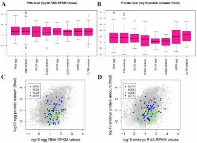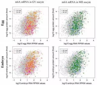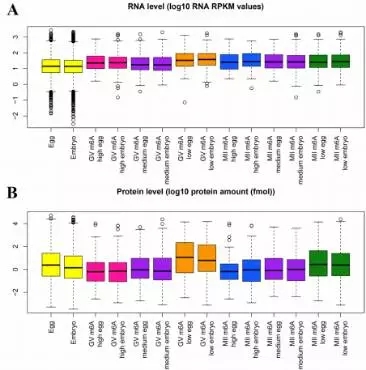 為了探索mRNAs甲基化是否與翻譯有關(guān),作者把mRNA甲基化數(shù)據(jù)與Smits等人已發(fā)表的轉(zhuǎn)錄組和蛋白組數(shù)據(jù)進(jìn)行了整合。通過BLAST分析,在RNA/蛋白數(shù)據(jù)中找到了723個m6A修飾mRNAs的信息。GV期或者M(jìn)II期卵母細(xì)胞中高m6A峰的RNA水平(log10 RNA RPKM值)比總RNA高(在卵或者胚胎中),但是蛋白水平(log10 protein amount / fmol)比總蛋白水平低(Figure 2)。與高度甲基化的mRNAs相比,低甲基化RNAs顯示出非常高的表達(dá)水平(Figure 3)。這些結(jié)果說明在卵母細(xì)胞或早期胚胎中,m6A修飾可能與mRNA翻譯有關(guān)。